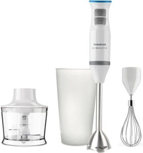 Este modelo incluye un batidor que facilita la preparación de masas para pasteles y cremas batidas con una textura perfecta. La picadora de 500 ml permite triturar ingredientes duros como nueces y hielo para preparar salsas y cócteles. Además, el vaso medidor de 700 ml es ideal para mezclar y servir directamente desde el mismo recipiente, minimizando la limpieza.