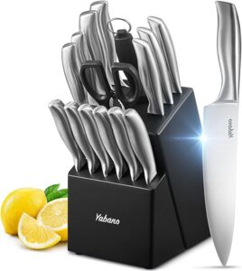 El set de cuchillos Yabano ofrece 16 piezas, lo que lo convierte en una opción ideal para aquellos que buscan un conjunto completo y versátil. Fabricado con acero alemán X50Cr15, promete durabilidad y rendimiento superior.