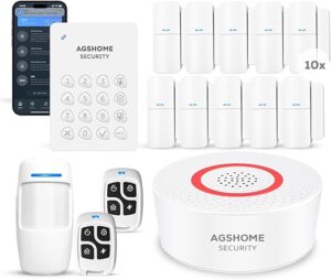 El sistema de alarma AGSHOME ofrece un kit de seguridad más grande, con 15 piezas, diseñado para proporcionar una protección integral para el hogar. También es compatible con Alexa y cuenta con una sirena de 120dB para una respuesta inmediata ante cualquier intento de intrusión.