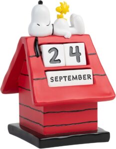 Fabricado en resina, con bloques intercambiables para días y meses. Diseño decorativo con la figura de Snoopy.