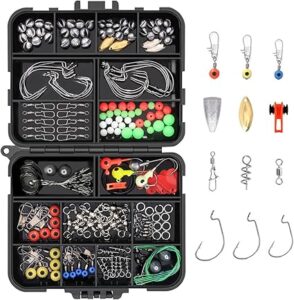 • Número de piezas: 191 piezas, incluyendo anzuelos, pesas de plomada, y otros accesorios.