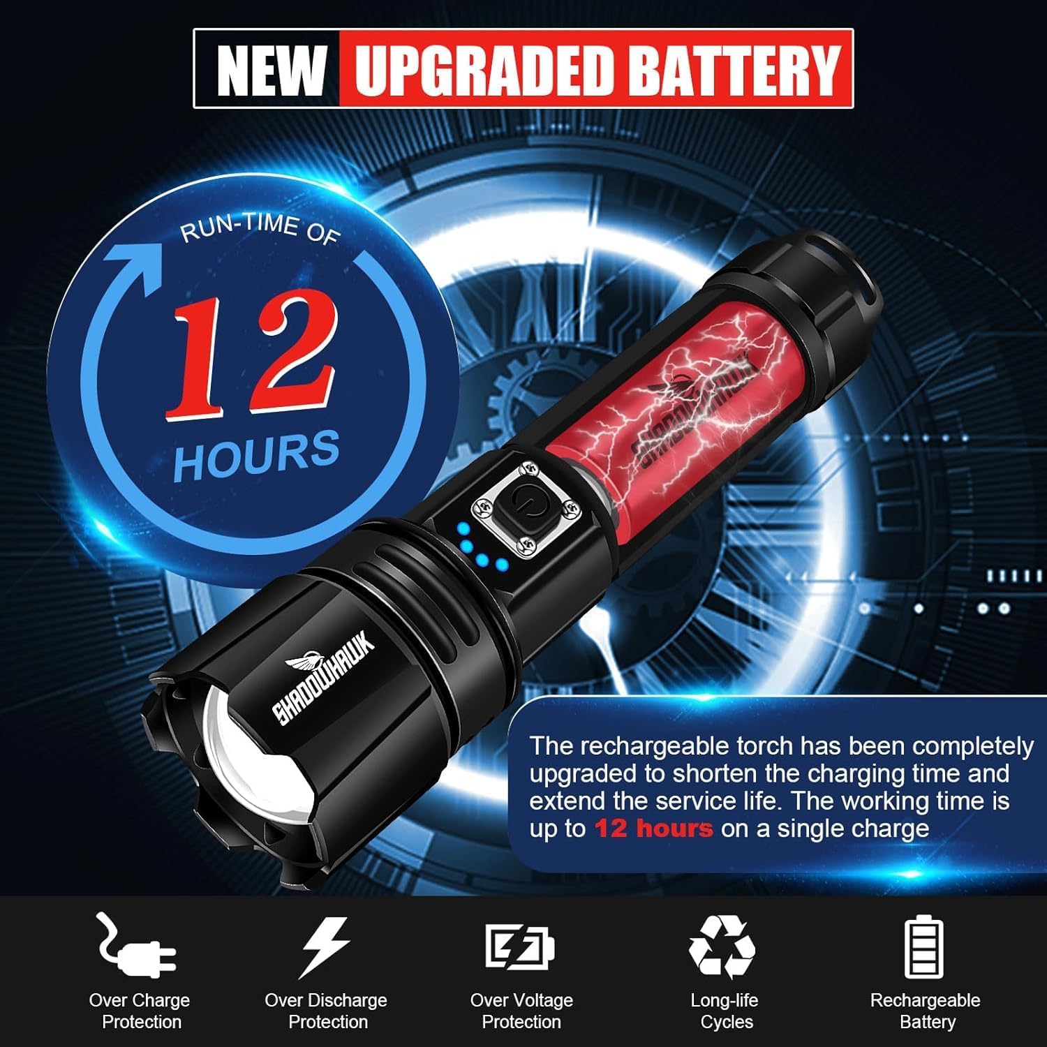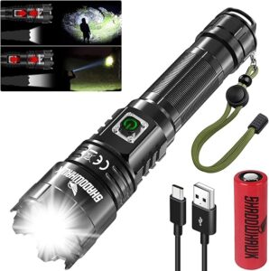 La linterna LED Shadowhawk de alta potencia, con 500,000 lúmenes, es una herramienta impresionante para quienes necesitan iluminación fiable y potente. Equipada con un LED XHP70.2 y recargable por USB, esta linterna táctica militar ofrece una luz intensa con 5 modos ajustables, perfecta para uso en exteriores, emergencias o actividades nocturnas. Su diseño impermeable IPX67 garantiza un rendimiento óptimo en condiciones climáticas adversas, mientras que su tamaño portátil y robusto la hace fácil de llevar. Si buscas una linterna de alto rendimiento para cualquier aventura o necesidad táctica, esta es una excelente opción.