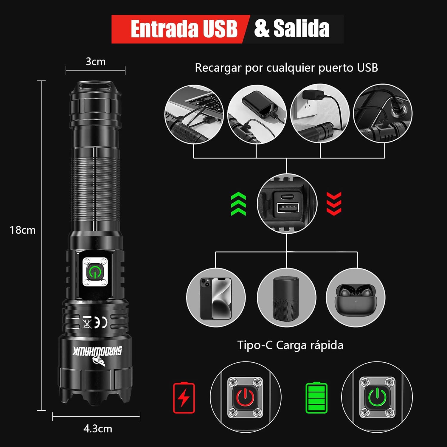 | Componentes incluidos | 1 x Shadowhawk S9322 Linternas Recargables Profesionales, 1 x Cable De Carga USB, 1 x Manual De Instrucciones, 1 x Batería |