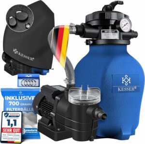 Depuradora de Agua KESSER: Este modelo ofrece una buena eficiencia energética (400 W) y una filtración silenciosa con solo 60-65 dB(A)/m. Su diseño moderno y compacto facilita su instalación. Aunque su capacidad de filtración es ligeramente menor (10 200 L/h), cumple con creces para piscinas de tamaño medio.