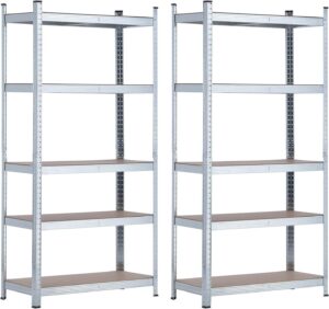 - Ventajas: Estantería resistente de acero cromado con patas niveladoras ajustables para mayor estabilidad. Cada balda soporta hasta 160 kg y tiene un límite de peso total de 800 kg. Ideal para usar en diversas habitaciones.