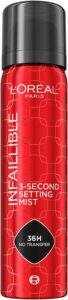 Spray fijador en aerosol con acabado satinado, resistente al agua y al sudor, que mantiene el maquillaje intacto hasta 36 horas.