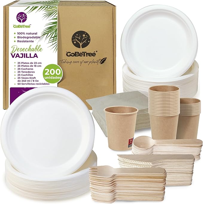 Comparativa: Platos, vasos y cubiertos desechables. Vajilla Desechable de 200 pcs para 25 personas VS Vexillic Vajilla de Fiesta, 200 piezas